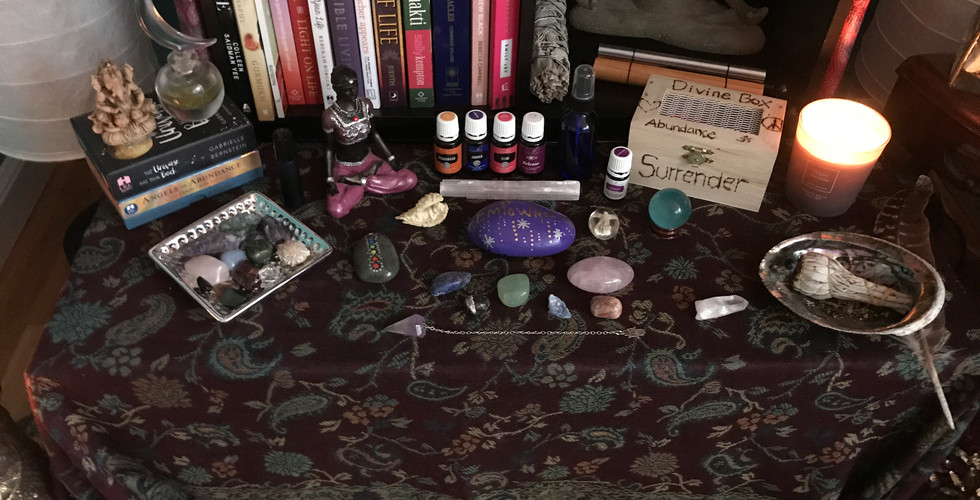 Next you will want to add items that have meaning or intention to you. They can be spiritual but don't limit yourself. If it makes you smile or feel good than give it a go! Some examples can be a salt lamp, crystals, essential oils, sage, statues of angels or other divine beings, a picture of a loved one. You can bring nature inside and maybe something from each of the elements. ( Fire, Water, Air, Earth, Wood) Whatever it is you choose let the vibe be high and let it be fun. Please don't stress over creating a sacred space.